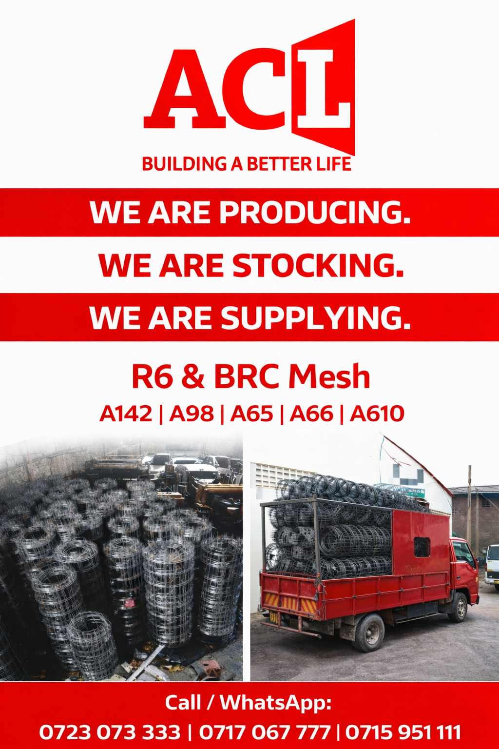 ACL Wire Products Ltd ensures strict quality control to guarantee reliable reinforcement mesh suitable for residential, commercial and industrial construction.Supply and Delivery of ACL BRC Mesh Kenya